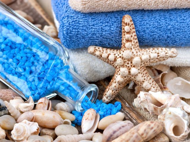 Обои Морская звезда, бутылка с морской солью, ракушки и полотенца