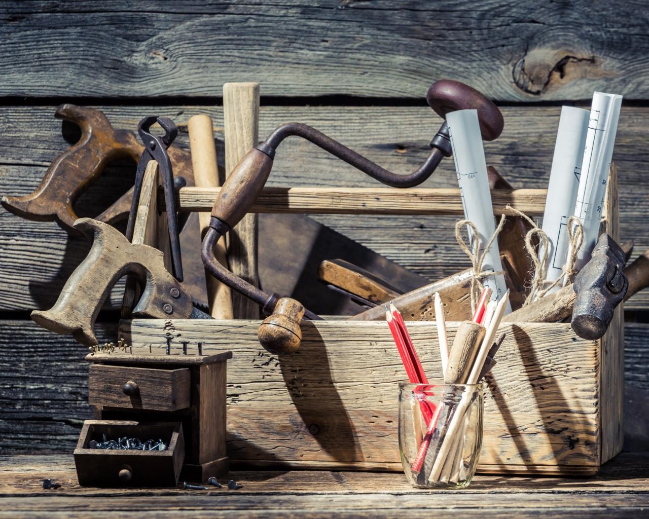 Обои Столярные инструменты в ящике на столе