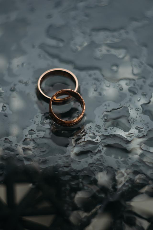 Обои Два обручальных кольца лежат на мокрой черной поверхности