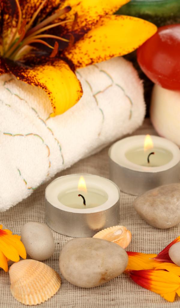 Обои Зажженные свечи на столе с полотенцем, цветами и мылом