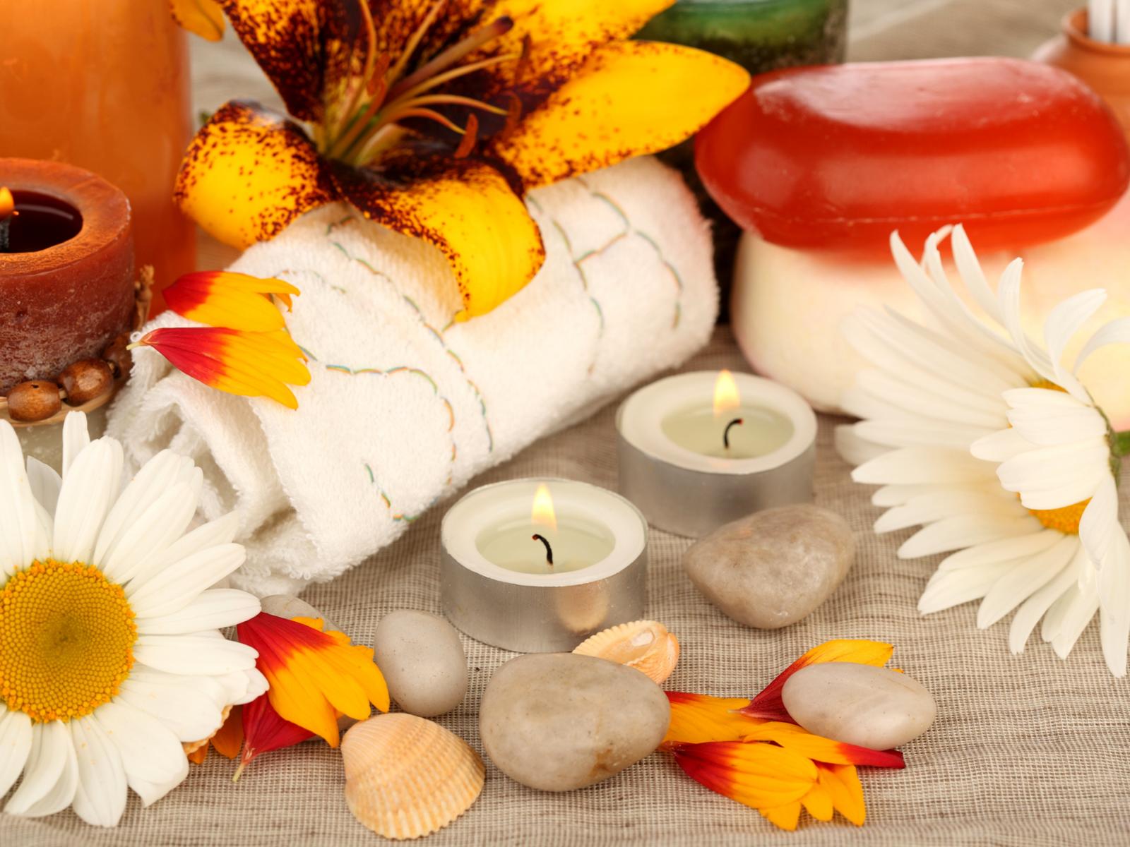 Обои Зажженные свечи на столе с полотенцем, цветами и мылом