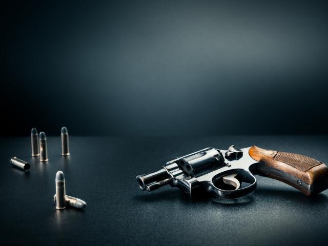 Обои Револьвер с пулями на сером фоне