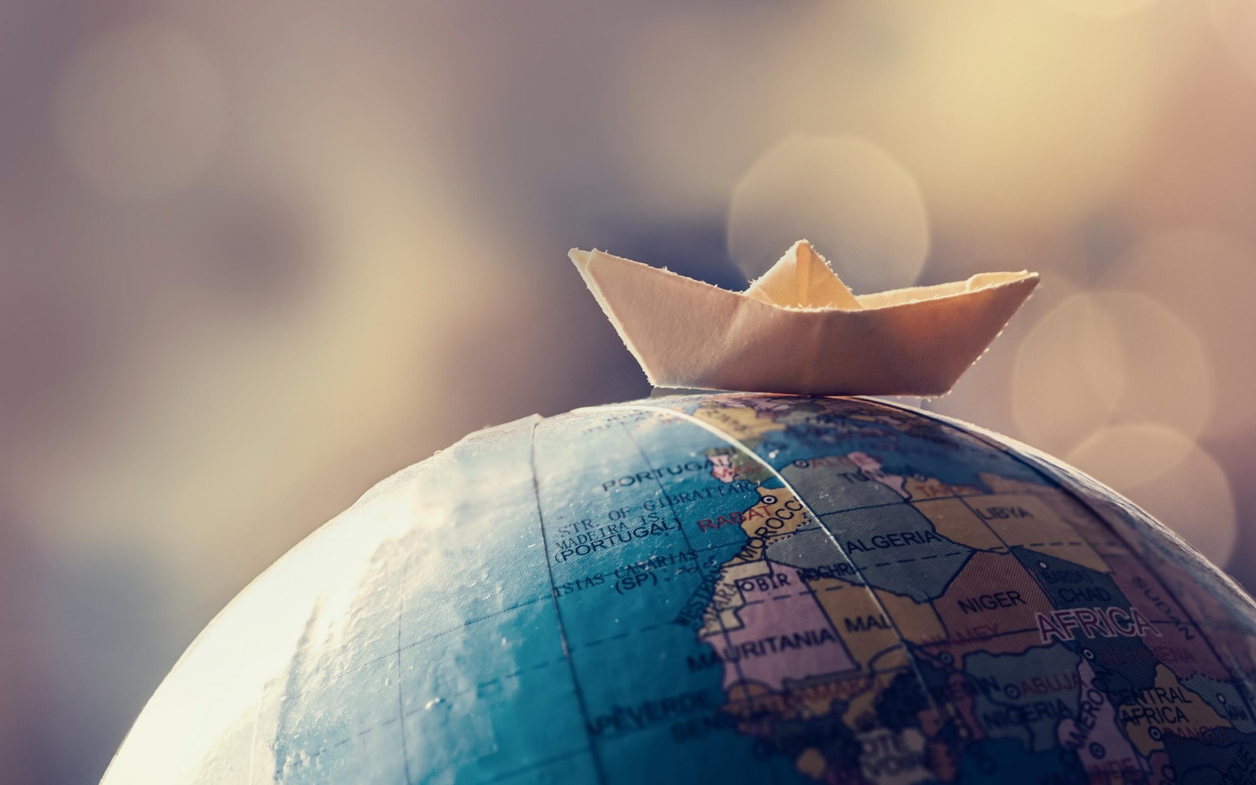 Обои Бумажный кораблик лежит на глобусе