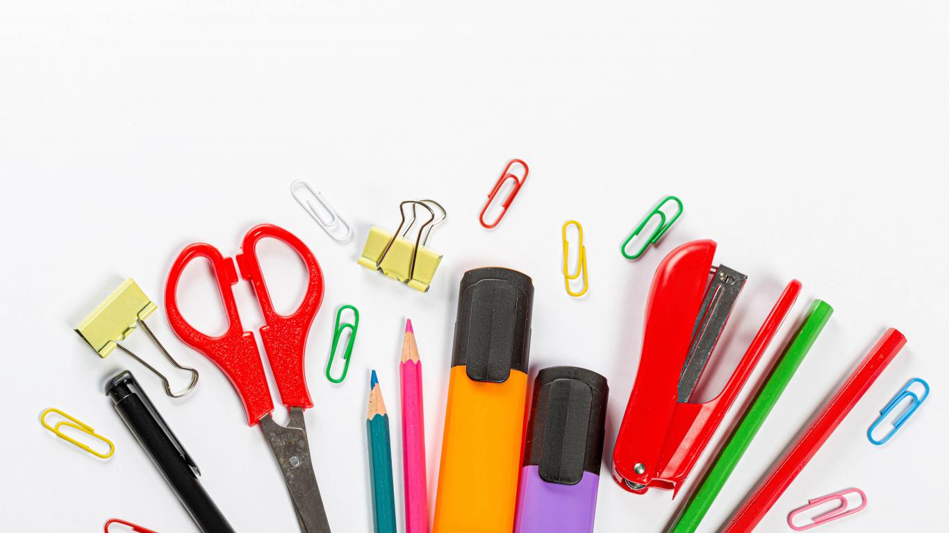 Обои Разноцветные канцелярские принадлежности на белом фоне