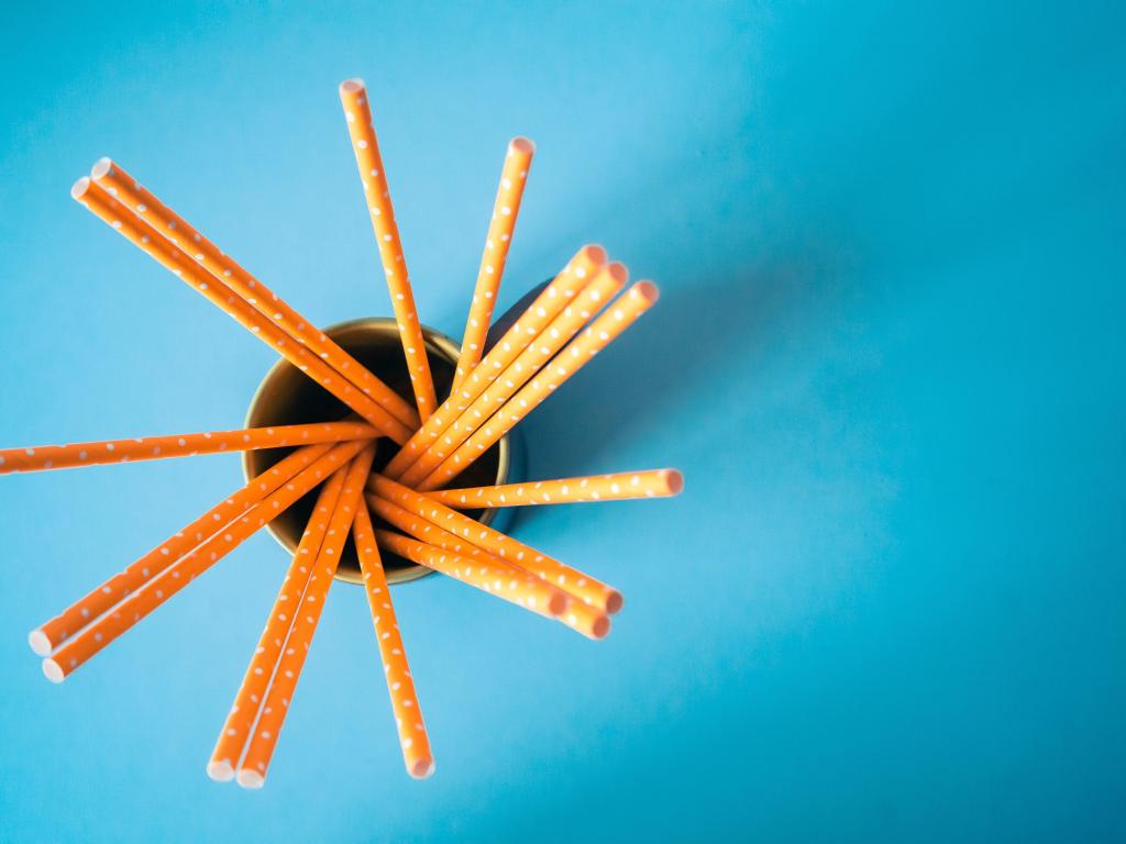 Обои Трубочки в стакане на голубом столе