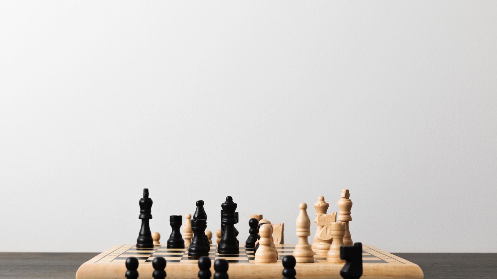 Обои Шахматная доска с фигурами на сером фоне