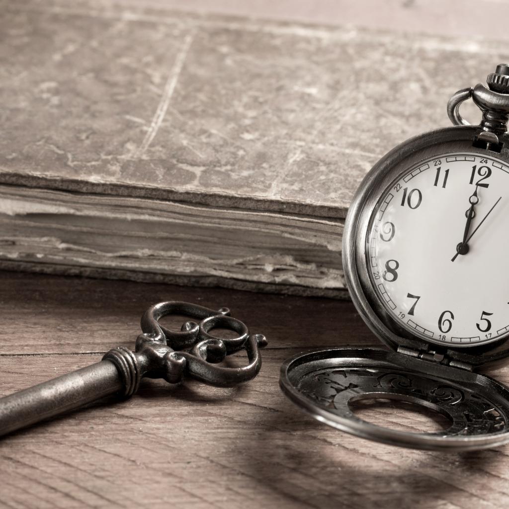 Обои Карманные часы на столе с ключом и старой книгой