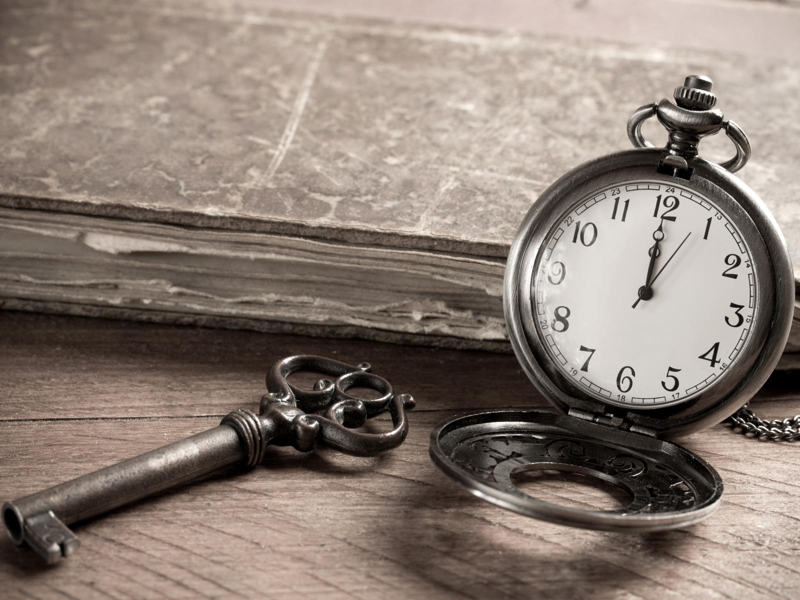 Обои Карманные часы на столе с ключом и старой книгой