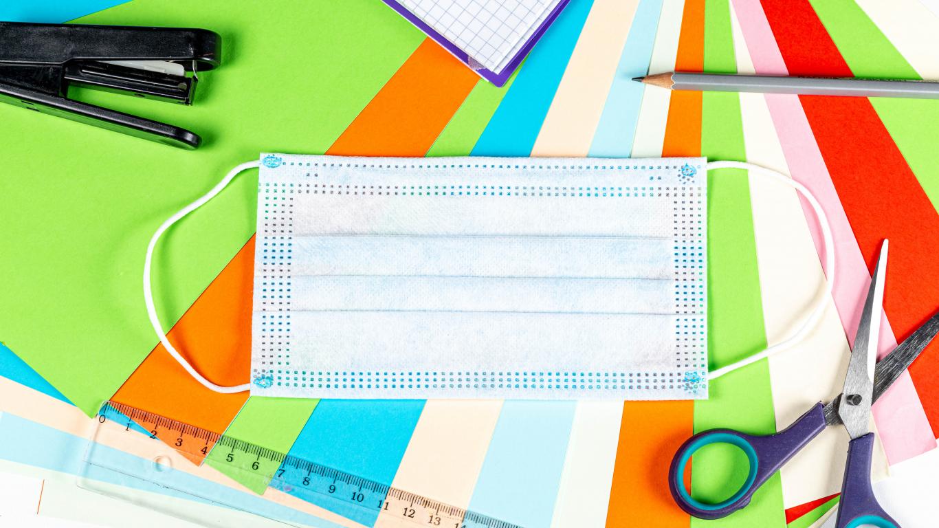 Обои Маска от коронавируса лежит на цветной бумаге с канцелярскими предметами