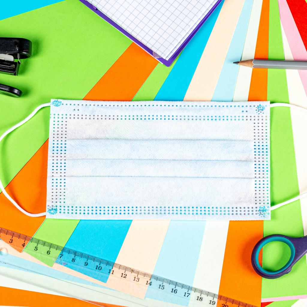 Обои Маска от коронавируса лежит на цветной бумаге с канцелярскими предметами