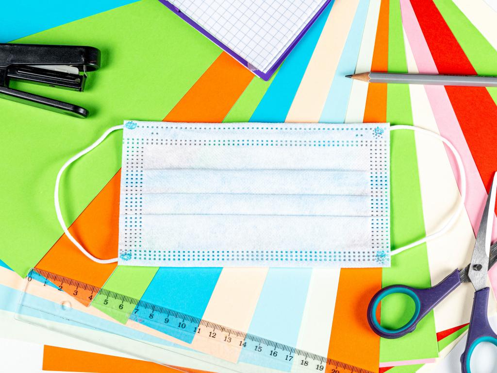 Обои Маска от коронавируса лежит на цветной бумаге с канцелярскими предметами