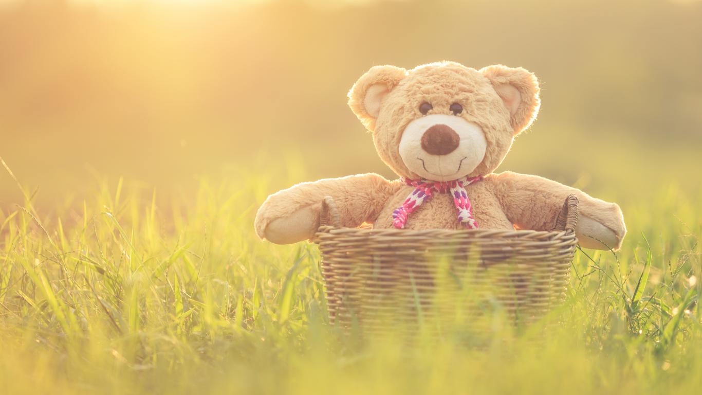Обои Плюшевый медведь в корзине стоит на зеленой траве