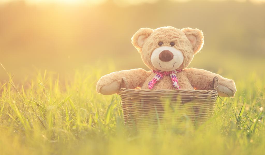 Обои Плюшевый медведь в корзине стоит на зеленой траве