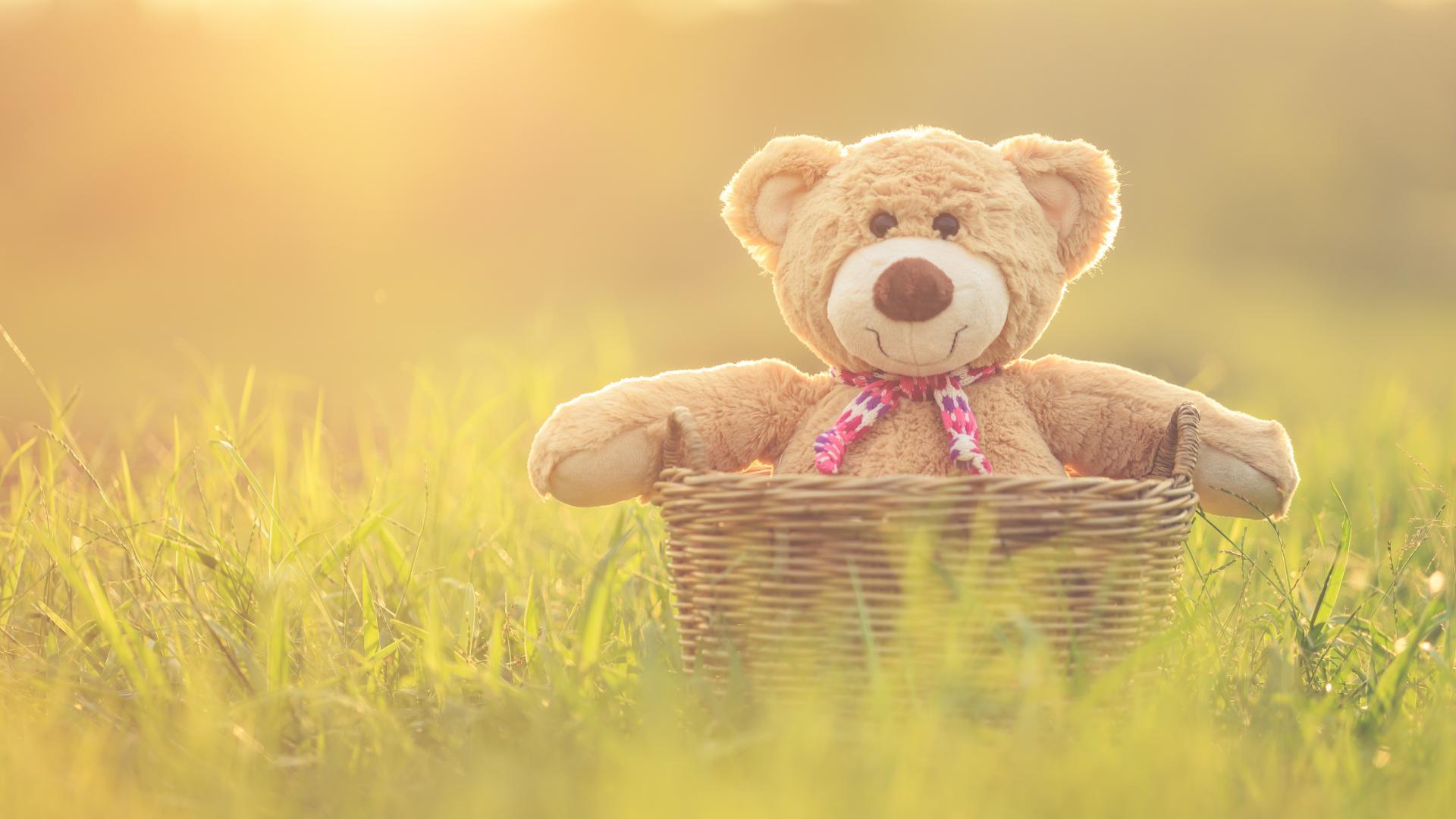 Обои Плюшевый медведь в корзине стоит на зеленой траве