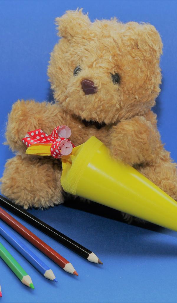 Обои Игрушечный медвежонок с карандашами на синем фоне