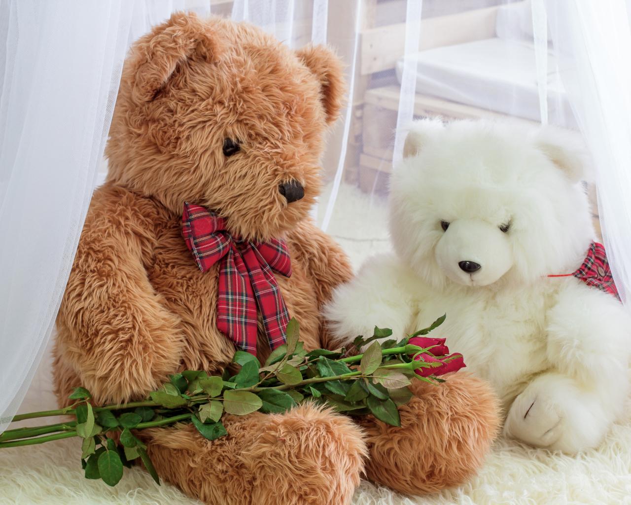 Обои Две белых игрушечных медведя и елочные украшения на Новый год 2018