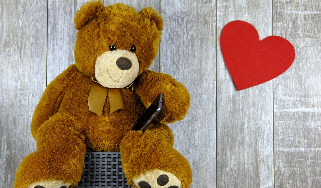 Обои Плюшевый медведь с красным сердцем на деревянном фоне