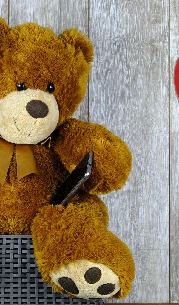 Обои Плюшевый медведь с красным сердцем на деревянном фоне