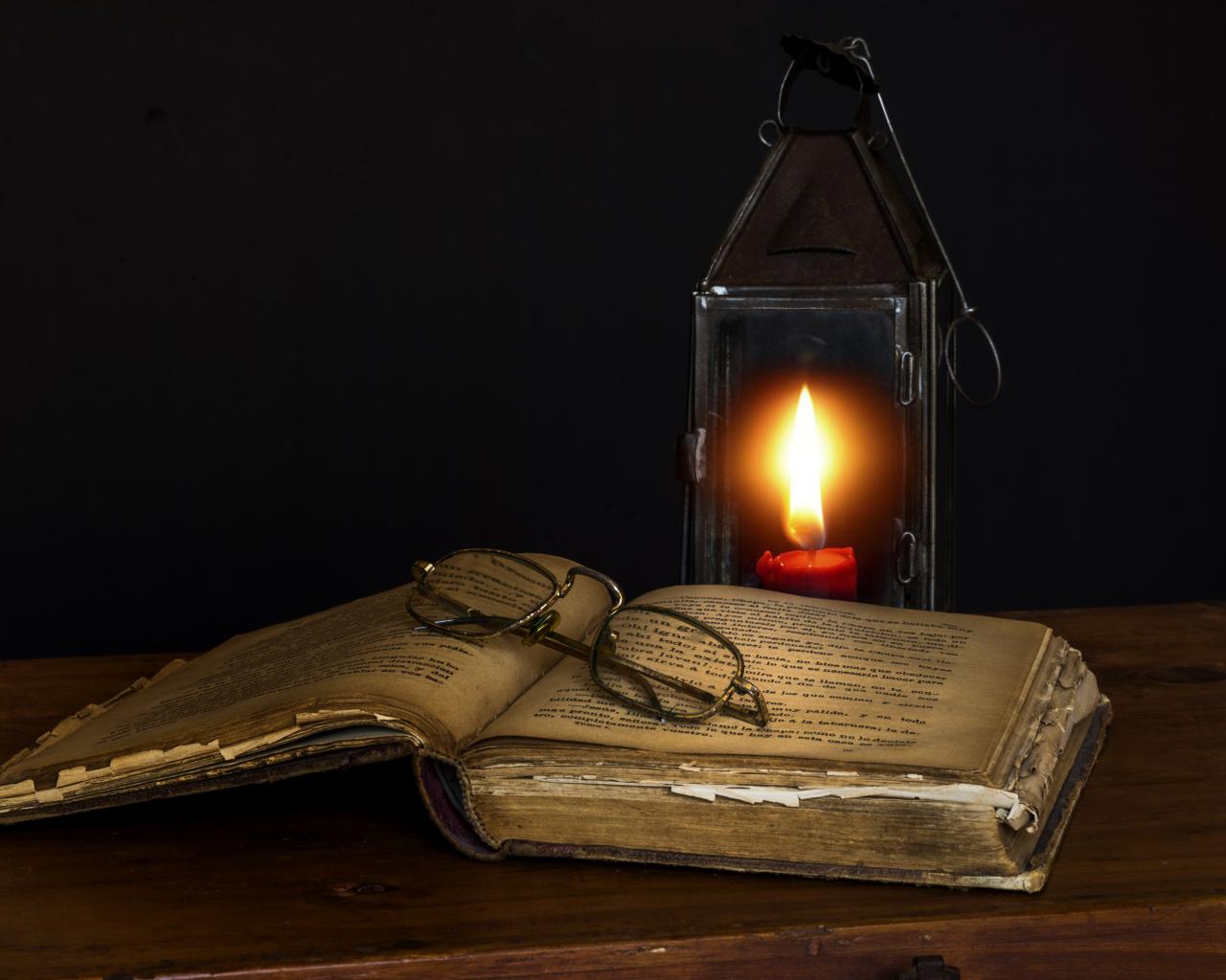 Обои Старая книга на столе с очками и лампой
