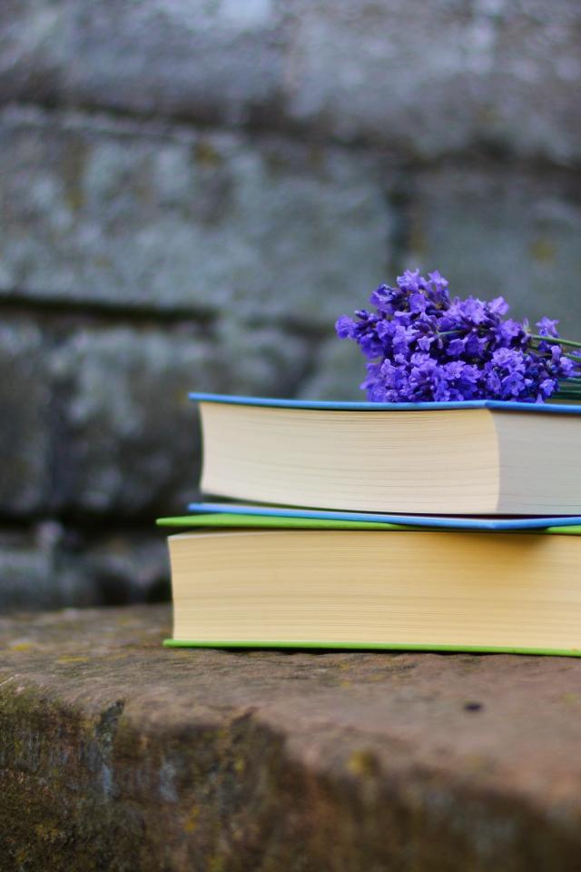 Обои Две книги лежат на камне с цветами лаванды