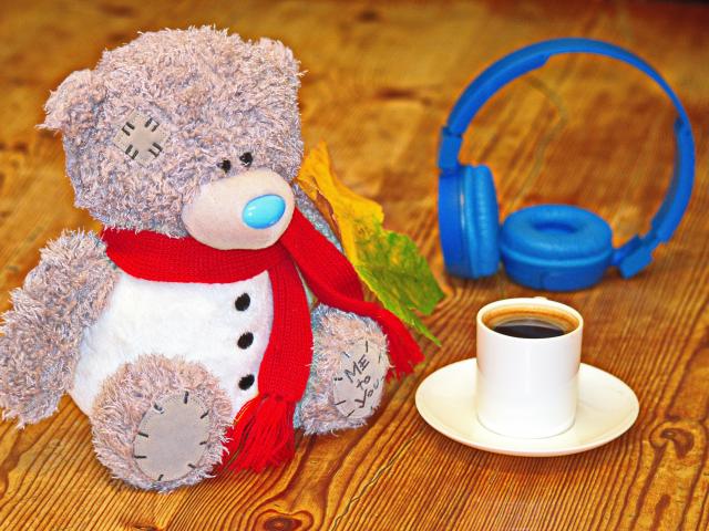 Обои Медведь на столе с чашкой кофе и наушниками