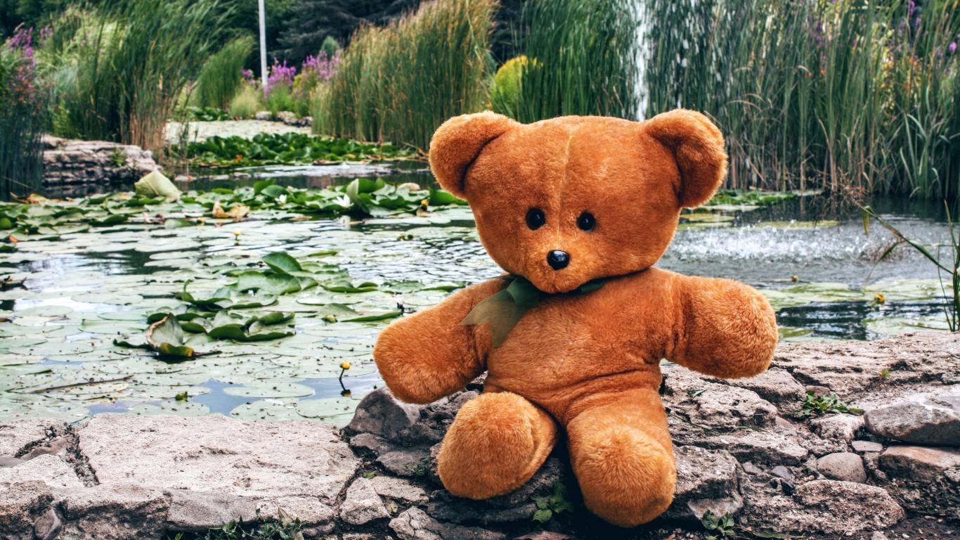 Обои Плюшевый медведь сидит на камне у пруда