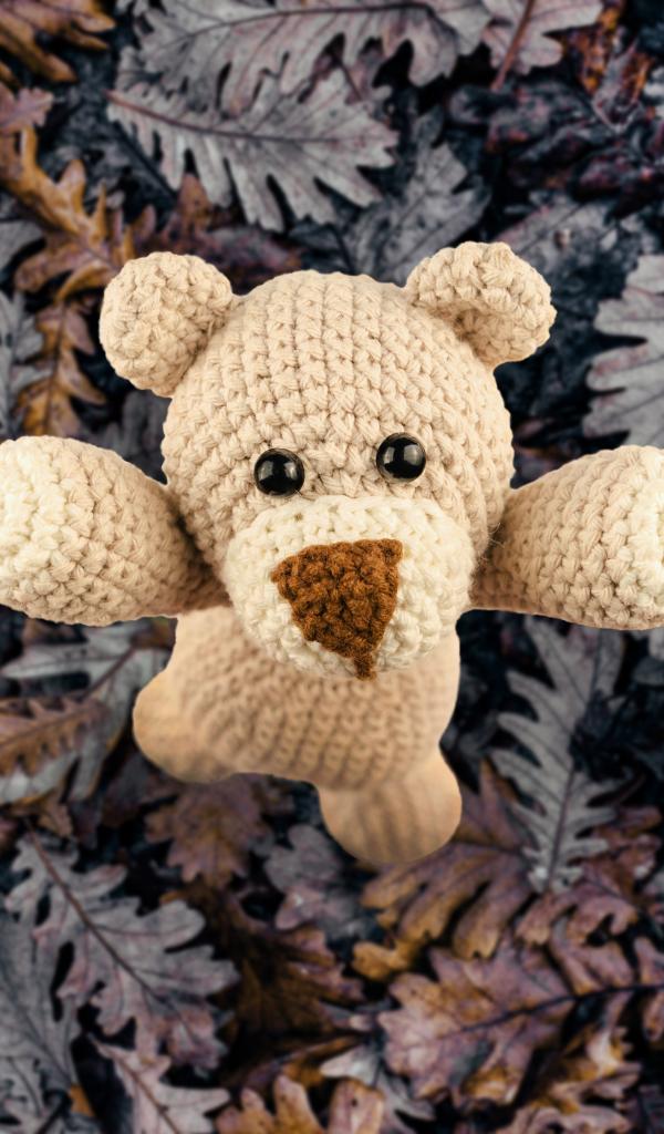 Обои Вязаная игрушка медвежонок на листве