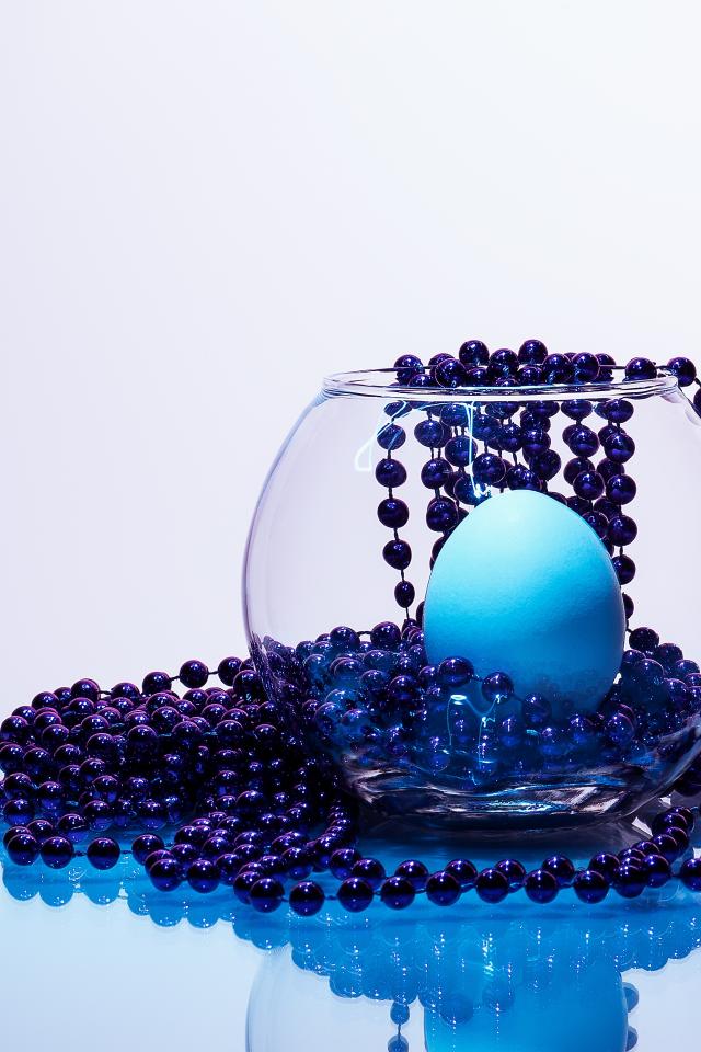 Обои Синие бусы на столе со стеклянной вазой и яйцом