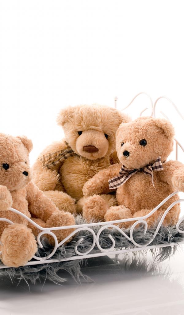 Обои Три игрушечных медведя на кровати на белом фоне