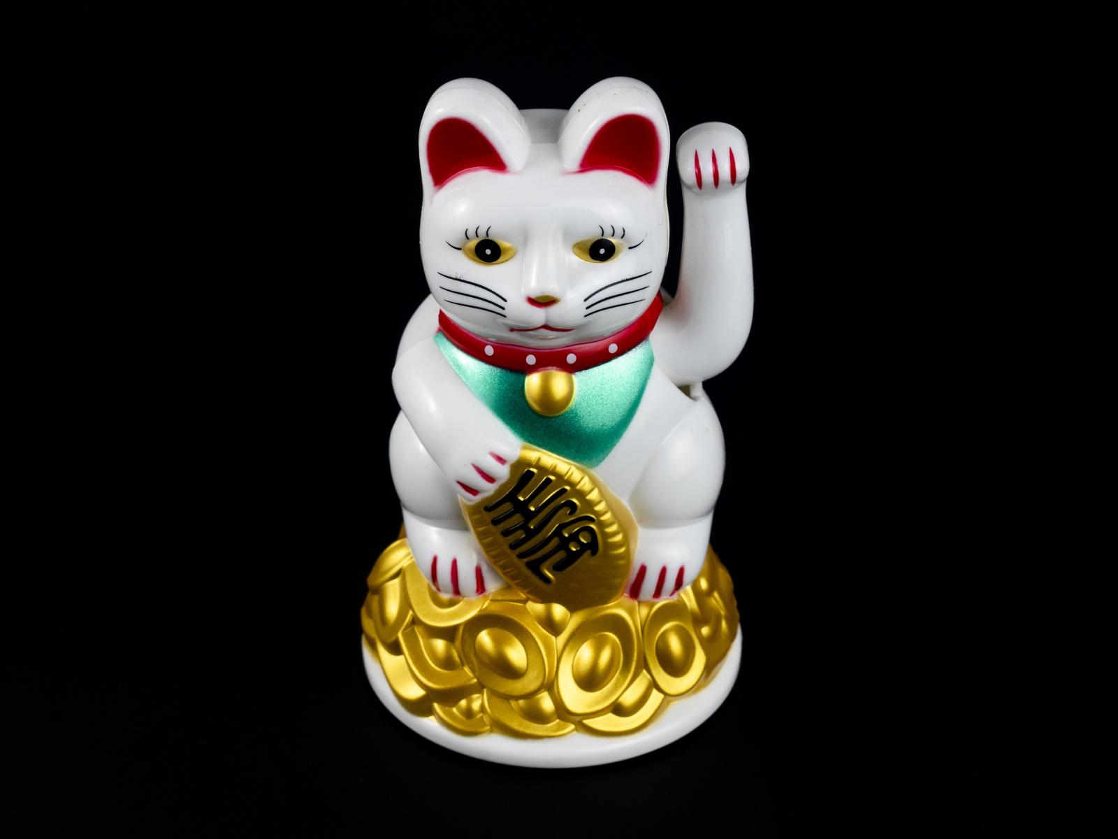 Обои Японская фигурка манэки-нэко кошка на черном фоне