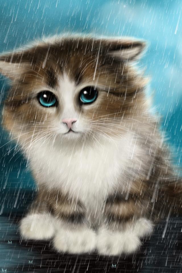 Обои Маленький грустный нарисованный котенок под дождем