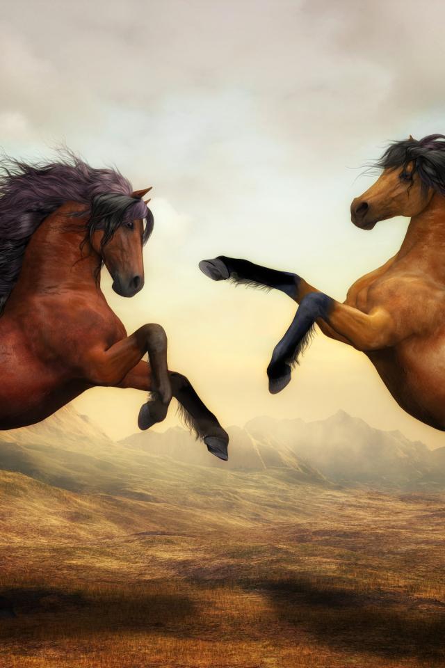 Обои Две нарисованные черные лошади скачут под грозовым небом