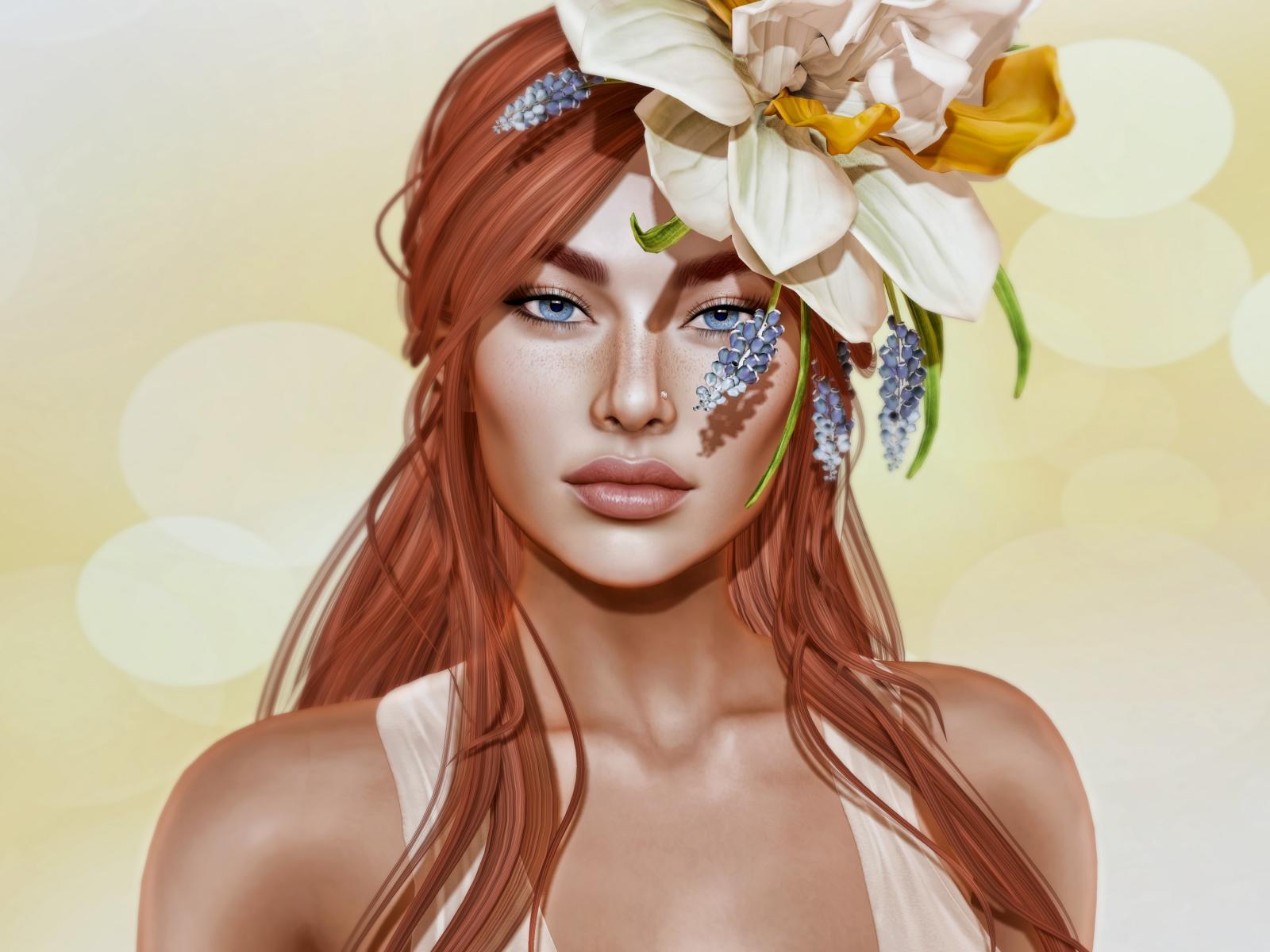Обои Нарисованная рыжеволосая девушка с большим цветком в волосах