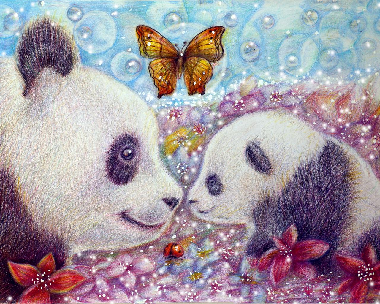 Обои Большая медведица панда с маленьким медвежонком и бабочками