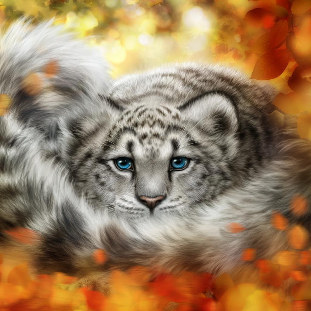 Обои Детеныш снежного барса в желтых листьях, рисунок
