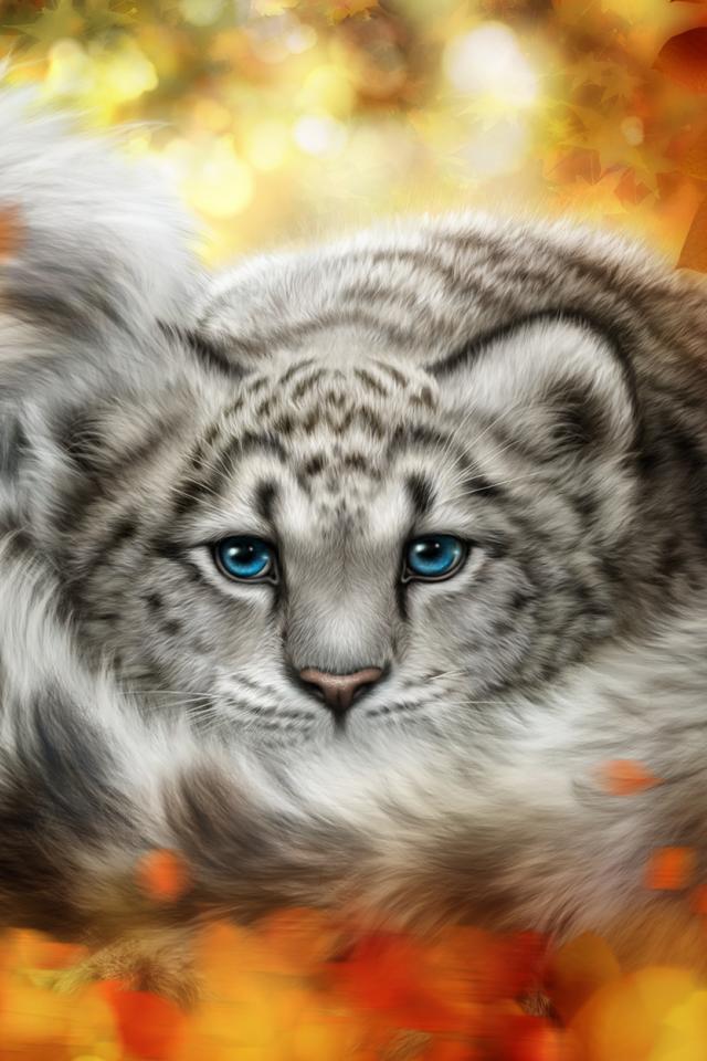 Обои Детеныш снежного барса в желтых листьях, рисунок