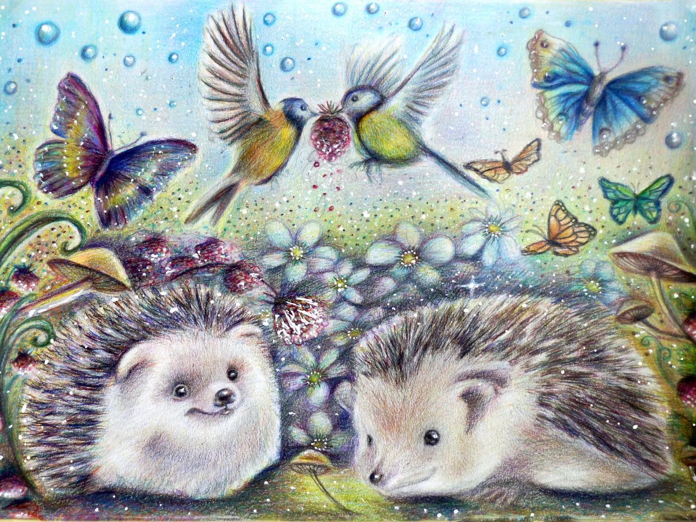 Обои Нарисованные ежики с бабочками и птичками
