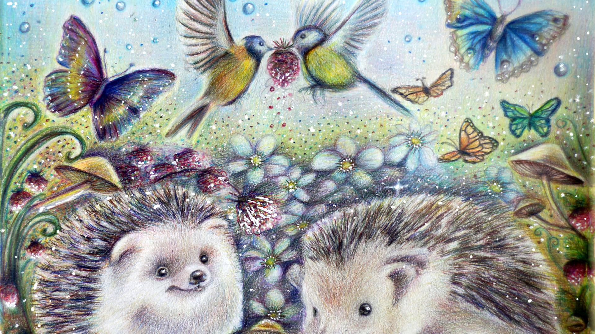 Обои Нарисованные ежики с бабочками и птичками