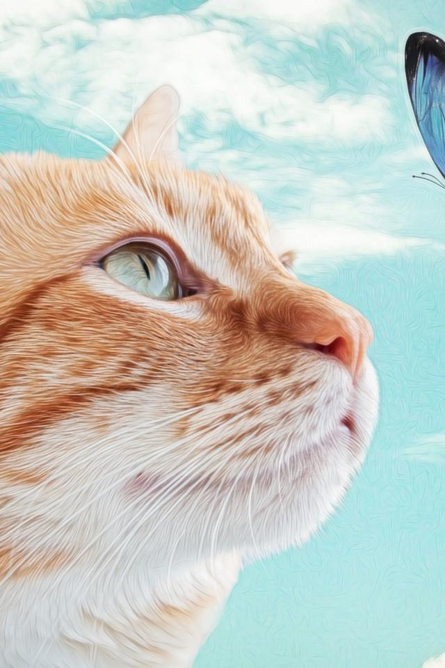 Обои Нарисованный рыжий кот с голубой бабочкой
