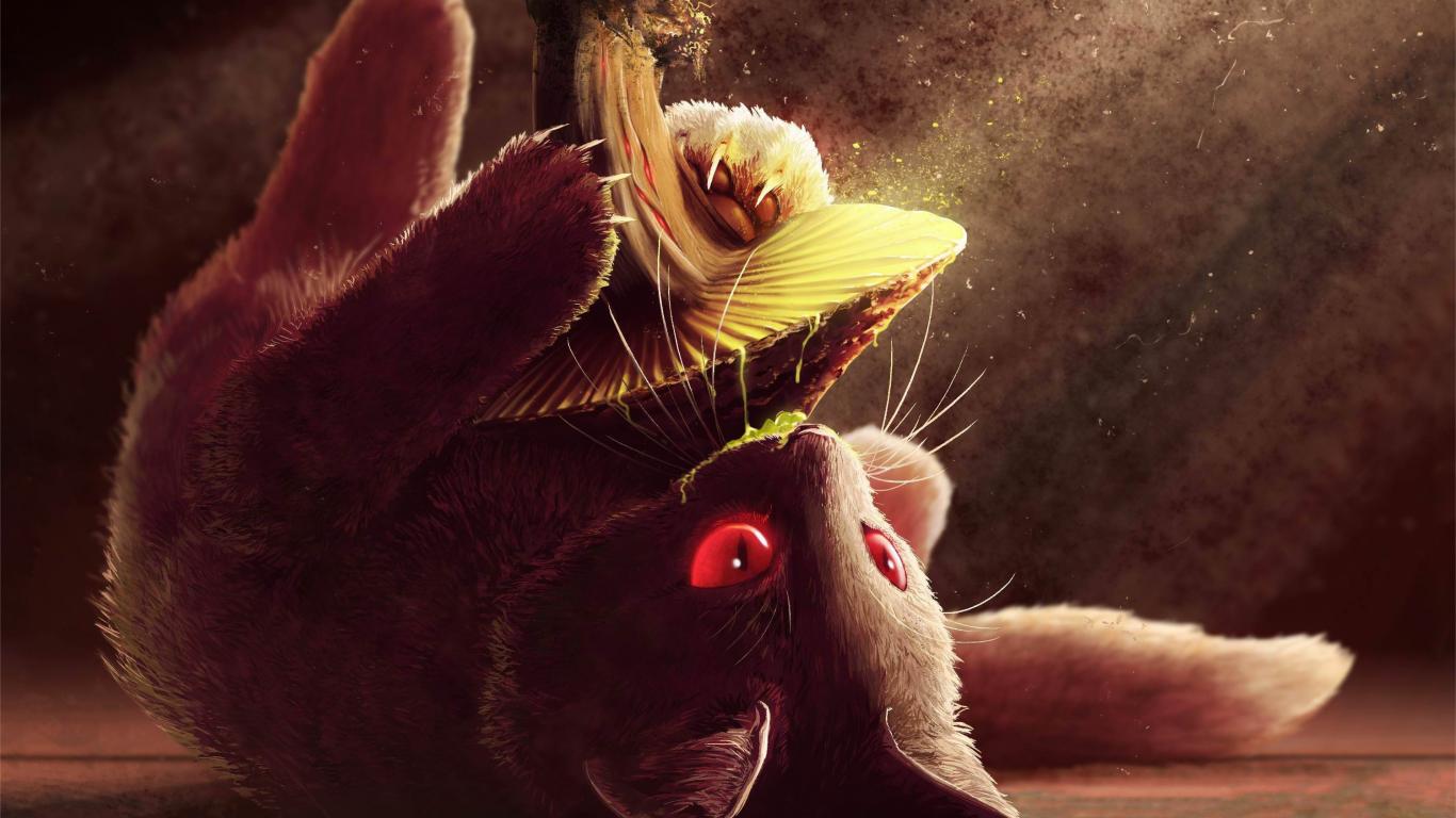 Обои Маленький нарисованный черный котенок с большими зелеными глазами
