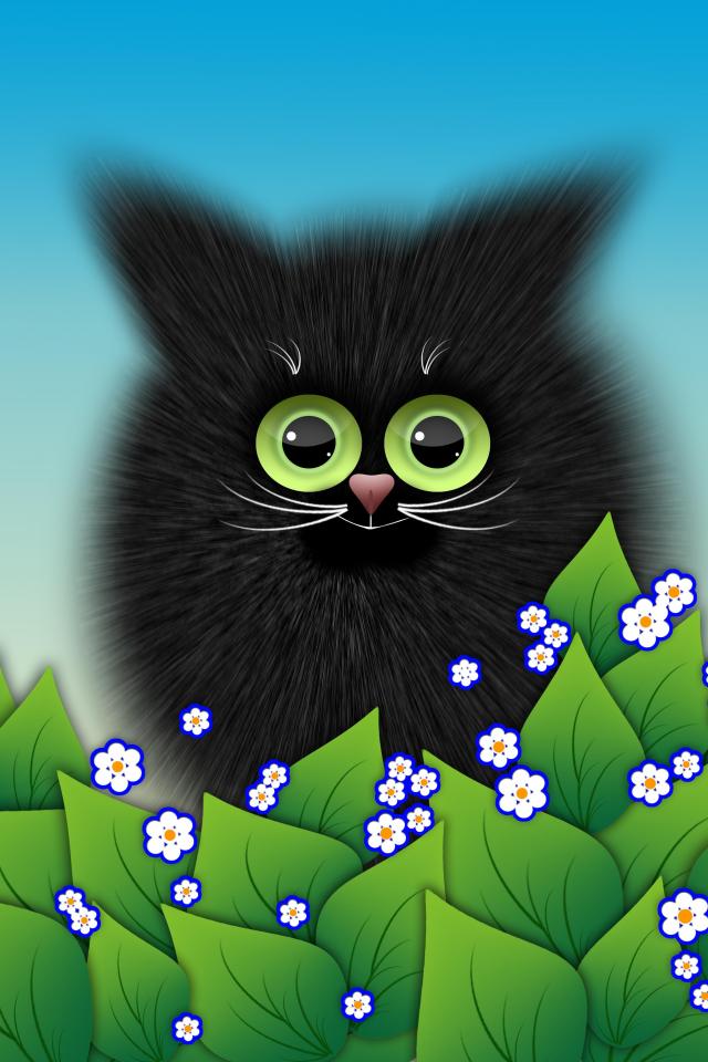 Обои Черный котенок с зелеными листьями векторный рисунок