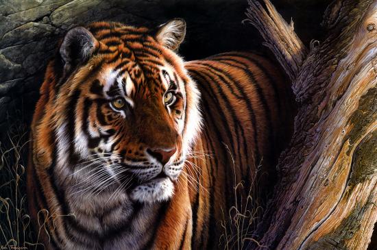 Обои Большой тигр точит когти о ствол дерева в зоопарке