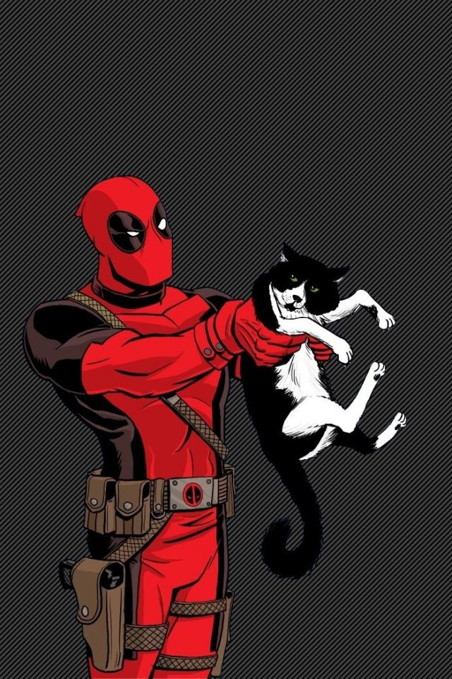 Обои Дэдпул держит в руках кошку