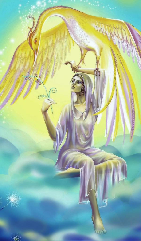 Обои Красивая фантастическая девушка держит на руке птицу феникс