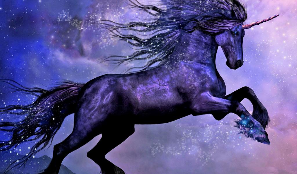 Обои Фантастический черный конь единорог на фоне луны