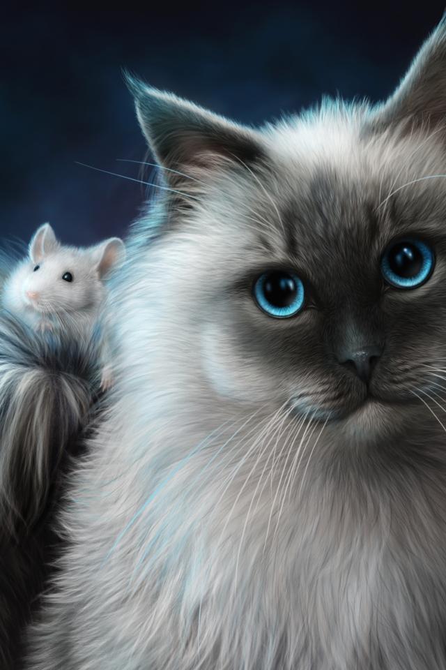 Обои Большой пушистый фантастический кот с белым мышонком
