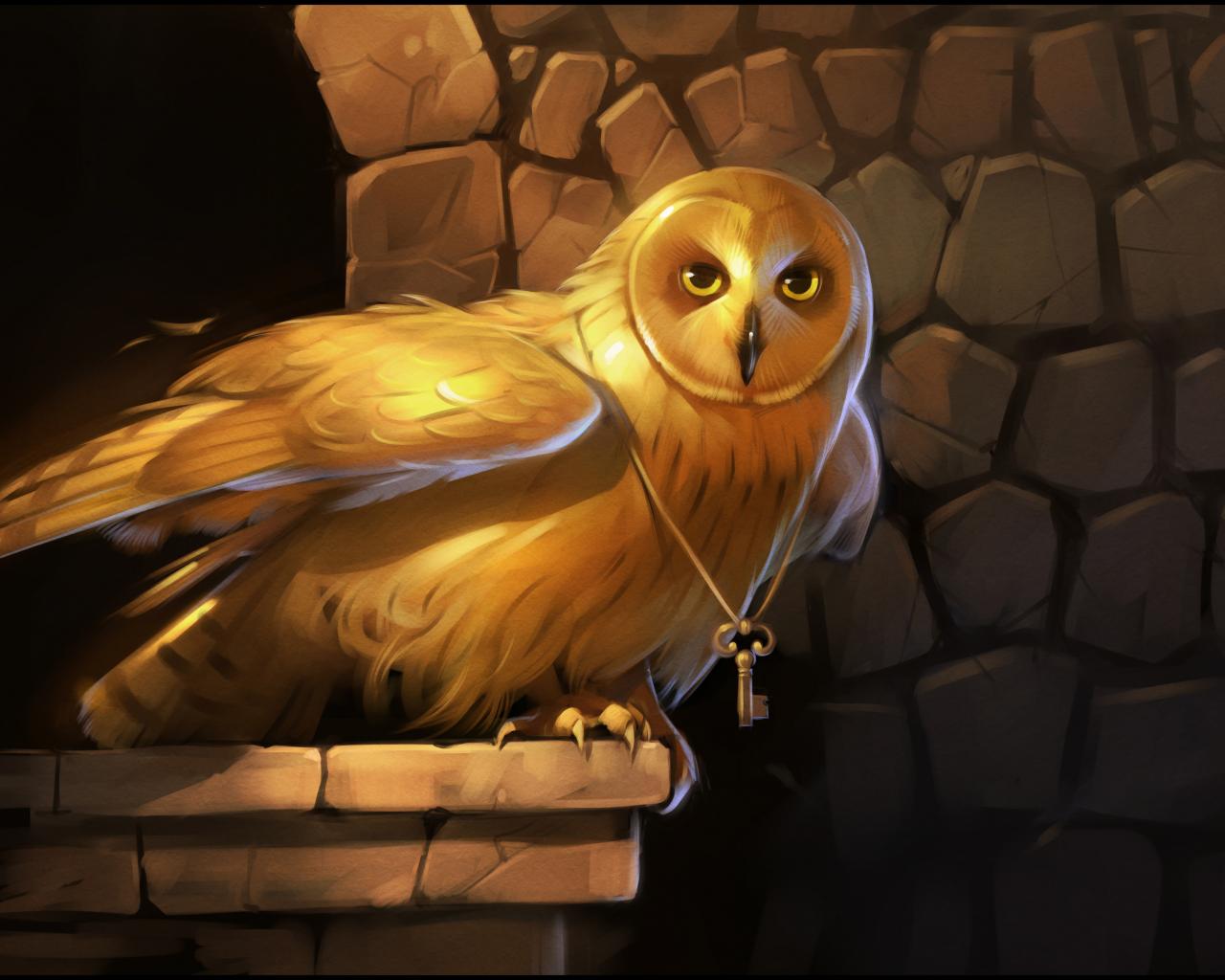 Обои Большая сова с золотым ключом на шее на фоне стены
