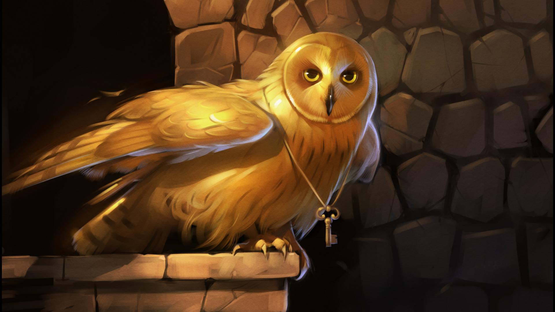 Обои Большая сова с золотым ключом на шее на фоне стены