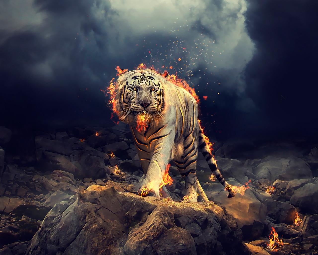 Обои Огненный тигр идет по камням
