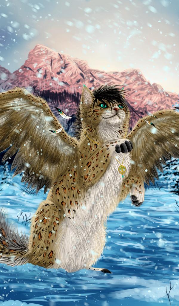 Обои Волшебный кот с крыльями в зимнем лесу, фэнтези